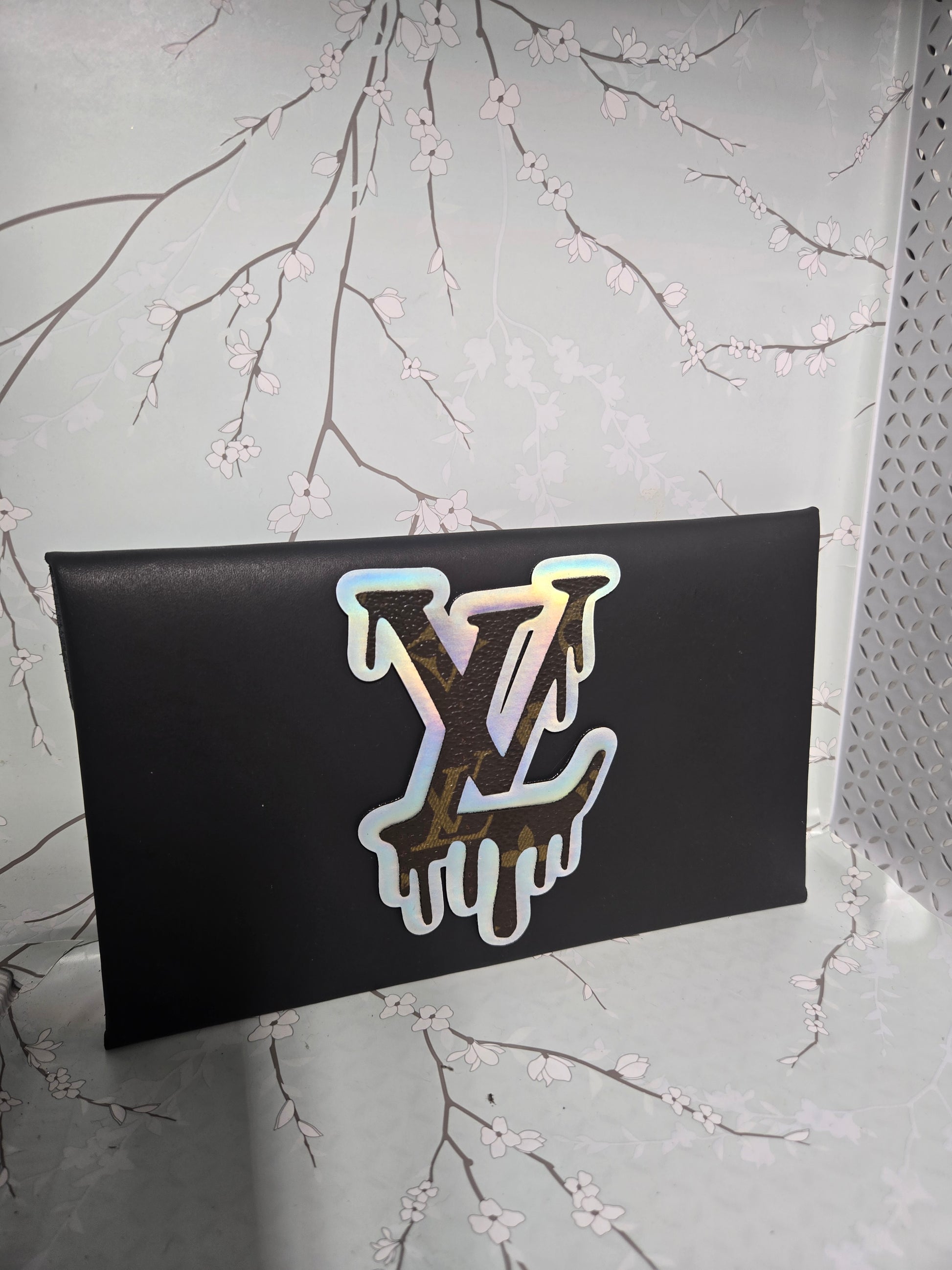 Made from authentic designer bags repurposed into something new, onto of lamb skin leather with a gold crossbody chain. Will fit an s24 plus or smaller.