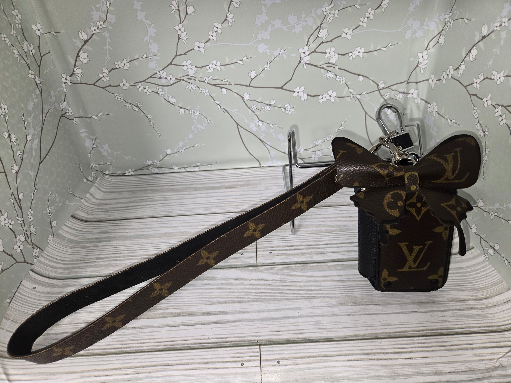 Upcycled from authentic designer bag cut into pieces and made into something new. Inside of wristlet keychain is lined with lamb skin leather you also get the butterfly charm and the keyfob holder. This is a combo of three pieces. This is a handmade product. Exact pattern may vary.