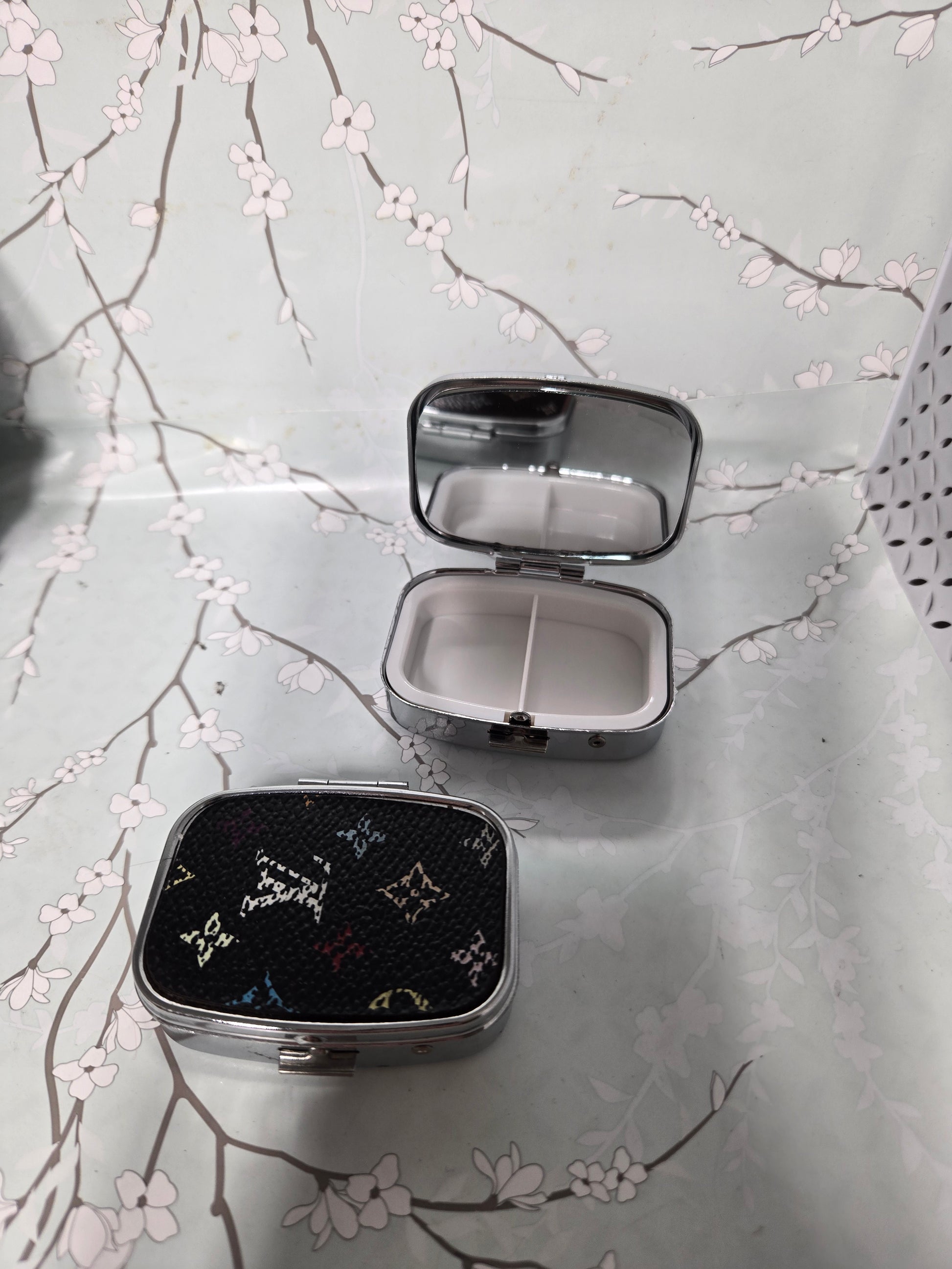 Stainless steel case with two small compartments. Upcycled with authentic materials perfect for on the go slide it into your pocket or into your purse. Great for everyone!