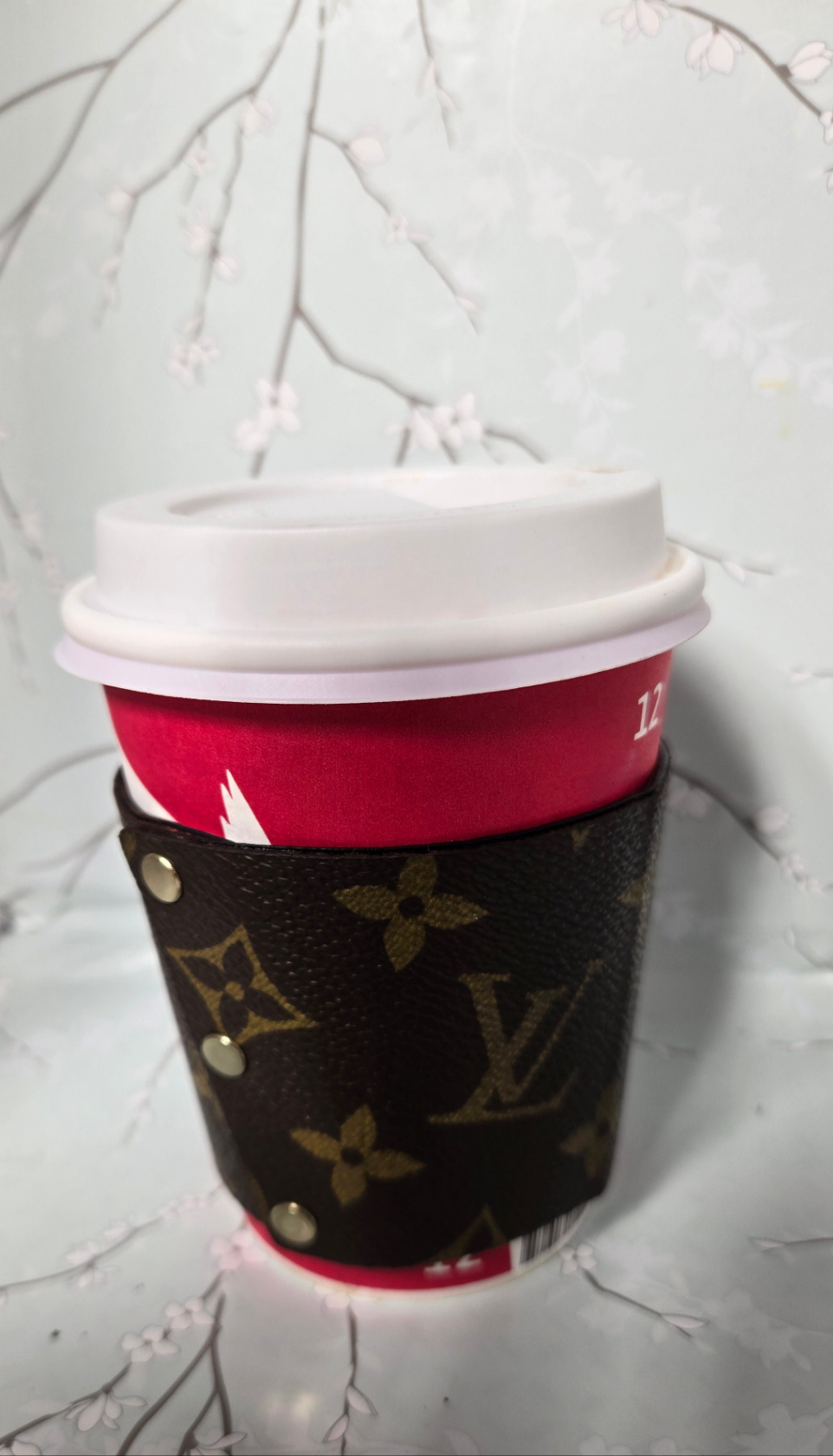 Handmade and upcycled from authentic vintage designer bags. Fits small coffee to large.