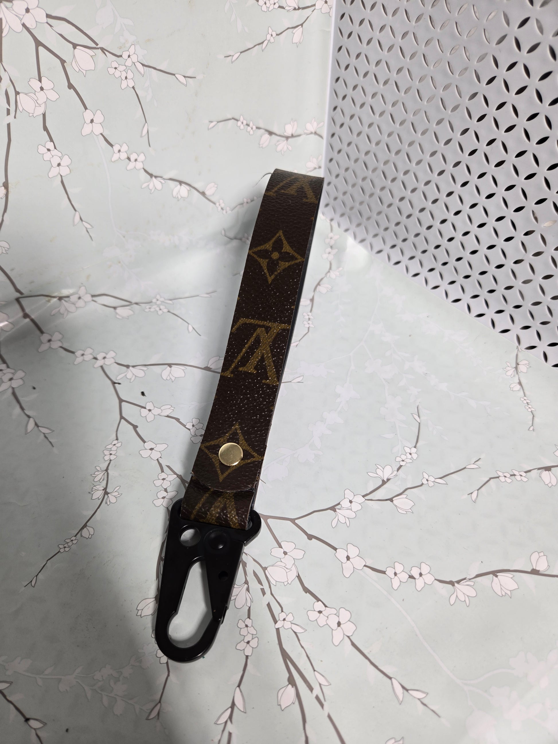 Upcycled from authentic designer bag cut into pieces and made into something new. Inside of wristlet keychain is lined with lamb skin leather. This is a handmade product. Exact pattern may vary.